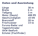 Zweibettkabinen und eine 6-Bettkabine mit Waschbecken und Heizung, Dusche und 2x WC sowie 2x Urinale. Der maritim eingerichtete Eß-und Aufenthaltsraum auf Deck trägt -auch mit seiner Bar- zum unvergesslichen Erlebnis einer Angelreise bei.