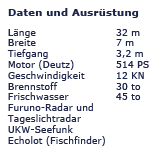 Zweibettkabinen und eine 6-Bettkabine mit Waschbecken und Heizung, Dusche und 2x WC sowie 2x Urinale. Der maritim eingerichtete Eß-und Aufenthaltsraum auf Deck trägt -auch mit seiner Bar- zum unvergesslichen Erlebnis einer Angelreise bei.